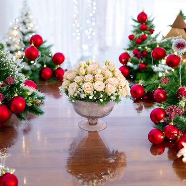 Make Christmas magical with stunning this table flower arrangement. Our arrangement combines a class with greenery, bringing elegance and cheer to every meal.
