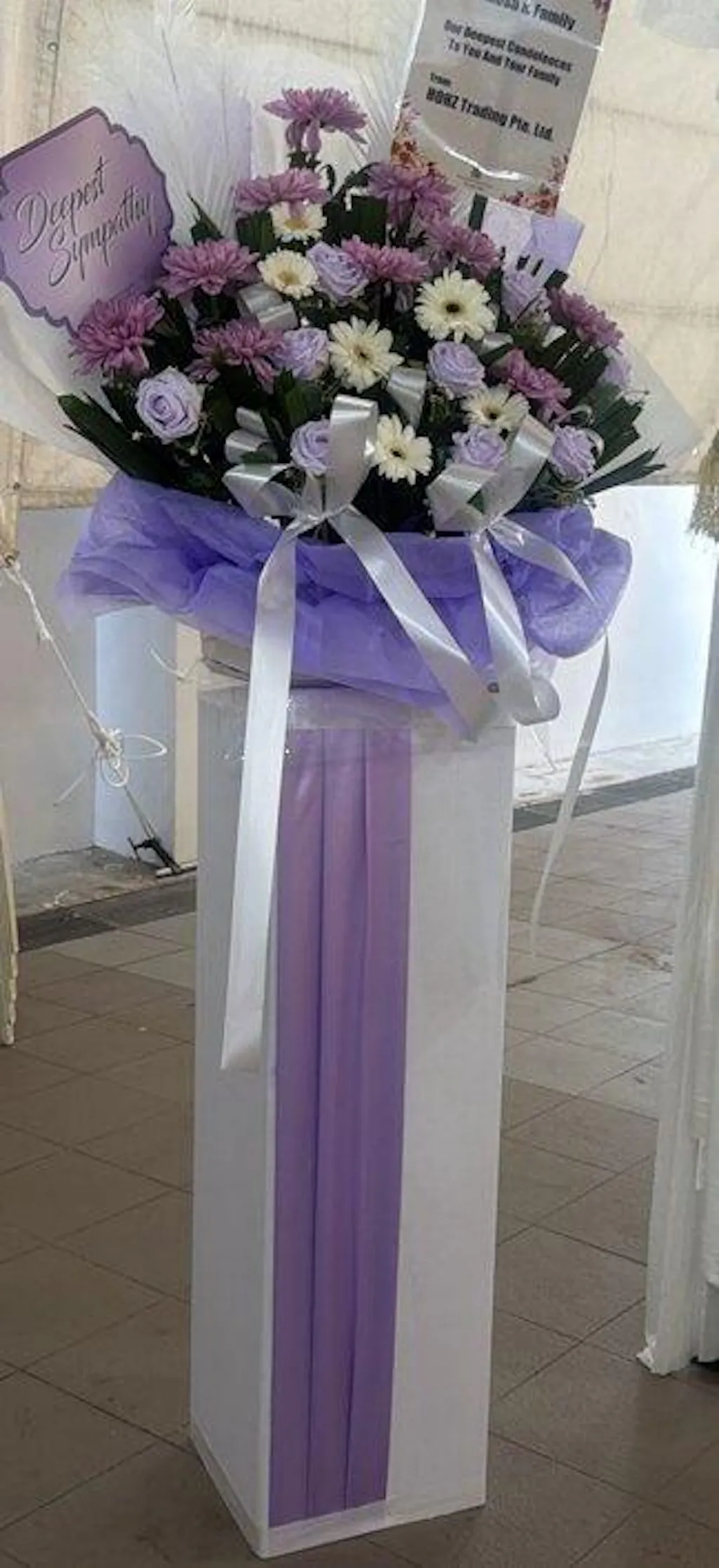 Condolence stand with fresh and silk flowers