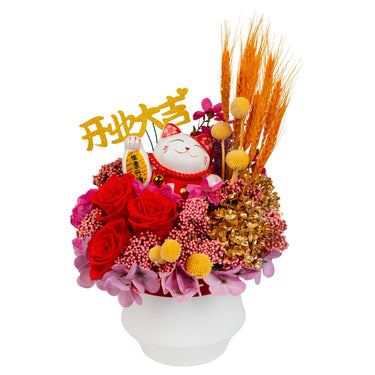 Send this everlasting table arrangement coupled with a Beckoning Cat (招财猫) Maneki-neko to wish your recipient the best of luck, overflowing fortunes and a strong start to their new venture!