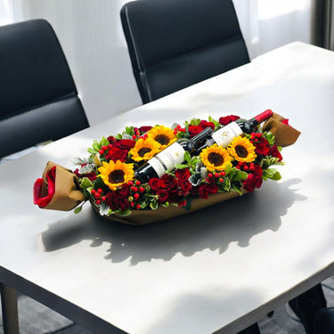 Looking to send some wine to a close friend or family with complimenting fresh flowers? This is the perfect table arrangement for you.